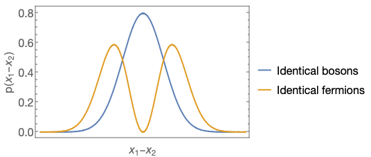 We can see that the two-electron wavefunction is zero when x_1 = x_2 due to the antisymmetry, and overall the effect of fermion statistics is that the two electrons repel each other, as opposed to the bosonic (symmetrized) case also shown where they are perfectly happy to coexist at the same point in space.