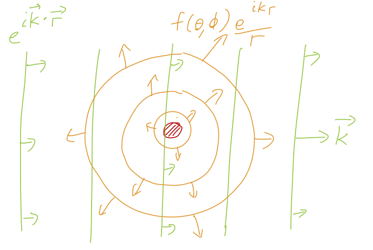 Restoring the full functional form from above, the total scattered part of the wavefunction is thus \psi^s(\vec{r}) = \sum_{l=0}^\infty \sum_{m=-l}^l B_{lm}^s h_l^{+}(kr) Y_l^m(\theta, \phi). To find the current, we need to take a gradient, but we really don’t want to evaluate the gradient of an arbitrary spherical Hankel function. Instead of attacking this directly, let’s remember that we’re doing a scattering experiment, which means what we really care about is the value of the current at very large r, where we will detect it. Thus, we can use the asymptotic form, h_l^{+}(kr) \approx \frac{\exp\left( i(kr - l\pi/2) \right)}{ikr} = i^{-(l+1)} \frac{e^{ikr}}{kr} + \mathcal{O}(\frac{1}{r^2}). So the asymptotic functional form is the same for all h_l^{+}(kr), with just the phase changing with l. This means that the gradient is, also asymptotically, \nabla h_l^{+}(kr) \approx i^{-l} \frac{e^{ikr}}{r} \hat{r} + \mathcal{O}\left(\frac{1}{r^2}\right) = ikh_l^{+}(kr) \hat{r}. For our wavefunction, notice that if apply the asymptotic expansion first, we can pull the radial dependence out of the sum completely: \psi^s(\vec{r}) \rightarrow \frac{e^{ikr}}{r} \sum_{l=0}^\infty \sum_{m=-l}^l B_{lm}^s \frac{i^{-(l+1)}}{k} Y_l^m(\theta, \phi) \\ \equiv \frac{e^{ikr}}{r} \mathcal{N} f(\theta, \phi, k) where f(\theta, \phi, k), which only depends on the incident energy and the scattering angle, is known as the scattering amplitude. (I’ve also pulled out a factor of the normalization of the incoming plane wave, which will cancel out soon.) This means that for the combination of terms in the probability current, (\psi^s)^\star \nabla \psi^s = \frac{e^{-ikr}}{r} \mathcal{N}^\star f^\star(\theta, \phi) \left[ ik\frac{e^{ikr}}{r} \mathcal{N} f(\theta, \phi) \hat{r} + \frac{e^{ikr}}{r} \mathcal{N} \nabla f(\theta, \phi) \right] \\ \approx \frac{k}{r^2} |\mathcal{N}|^2 \left[ i|f(\theta, \phi)|^2 \hat{r} \right] + \mathcal{O} \left( \frac{1}{r^3} \right), where I’m relying one more time on the asymptotic expansion to discard the gradient \nabla f; since f is purely a function of angles, the surviving terms in the gradient in spherical coordinates all come with at least a factor of 1/r, so in the leading asymptotic expansion we should simply ignore it. Putting the pieces together, we have for the scattering current \vec{j}_{\rm scatter} \approx \frac{\hbar k}{m} |\mathcal{N}|^2 \frac{1}{r^2} |f(\theta, \phi, k)|^2 \hat{r}. While the incoming current is constant, the scattering current dies off as 1/r^2. This is just what we expect, since the incoming beam is unidirectional but the scattered particles are spreading out over the surface of an ever-larger sphere as r increases. To convert this into a scattering rate, we should integrate it over some area; we’ll take an infinitesimal chunk of the scattering sphere of area dA = r^2 d\Omega (this could represent the area of our detector.) Then we have for the rate through this area \frac{d\Gamma_{s}}{d\Omega} = \frac{\hbar k}{m} |\mathcal{N}|^2 |f(\theta, \phi, k)|^2. But |\mathcal{N}|^2 \hbar k/m is exactly the incoming flux \vec{j}_{\rm in}, which is also the instantaneous luminosity \mathcal{L}, as we observed in the general case above. So by inspection, we find the key result given above, that \frac{d\sigma}{d\Omega} = |f(\theta, \phi, k)|^2.