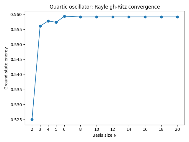 Unfortunately, there isn’t really a good example for us to do on the board; the Rayleigh-Ritz method mainly lends itself to the use of computers, since it’s most effective when we can use a large basis. I’ll at least set up a common example for you, which is the anharmonic oscillator: \hat{H} = \frac{\hat{p}^2}{2m} + \frac{1}{2} m \omega^2 \hat{x}^2 + \lambda \hat{x}^4. Perturbation theory can allow us to make some progress here, but no matter how small \lambda is the perturbative solution will always break down for the higher excited states. However, the Rayleigh-Ritz variational method is quite effective here. The unperturbed harmonic oscillator states \ket{n} give us a natural choice of trial basis, up to some chosen maximum n. Working in that basis, we can rewrite \hat{x}^4 \propto (\hat{a} + \hat{a}^\dagger)^4 This gives us an extremely nice-looking Hamiltonian as a matrix in the trial basis. In particular, the Hamiltonian is band diagonal; the \hat{x}^4 term only connects state \ket{n} to states between \ket{n-4} and \ket{n+4}, and all other matrix elements further from the diagonal are guaranteed to be zero. Diagonalizing the Hamiltonian in some finite basis is thus relatively easy. Here’s what I get if I carry this procedure out as a function of the number of basis states N used, setting \lambda = 0.1 and all other physical quantities to 1 for simplicity: